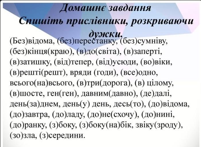 Без відома, безперестанку, без сумніву, без кінця-краю, вдосвіта, взаперті, в затишку, відтепер, відусюди, во віки, врешті-решт, вряди-годи, все одно, всього-на-всього, втридорога, в цілому, вшосте, ген-ген, давним-давно, дедалі, день за днем, день-у-день, десь-то, до відома, до завтра, до ладу, донесхочу, донині, до ранку, збоку, з боку на бік, звіку-зроду, зо зла, зсередини.