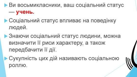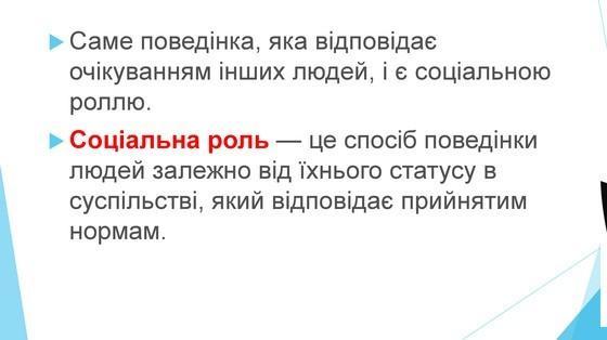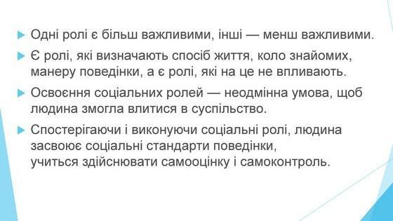 Соціальна роль передбачає певні правила поведінки людини відповідно до її позиції в суспільстві. У кожної людини ролі змінюються як упродовж дня, так і впродовж життя.