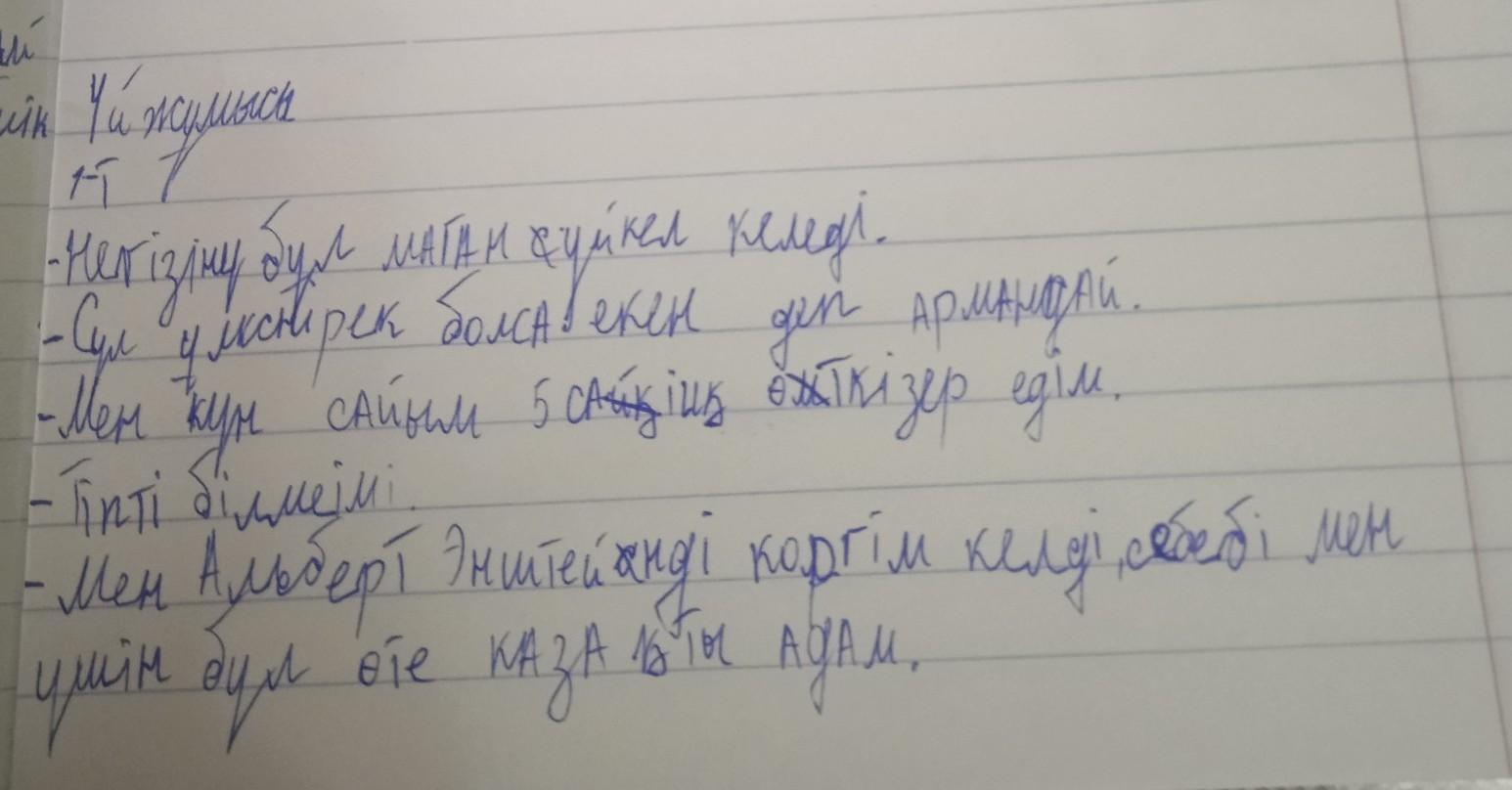 - АЙТЫЛЫМ 1-тапсырма. Диалогті толықтырыңдар, Мектебіндегі оку жүйесін өзгерткің келе ме? - Сен армандаған мектеп қандай болуы керек? Сабақ кестесін өзің құруға мүмкіндік берілсе, не істер едің? — Сен армандаған мектепте қандай үйірмелердің ғұмыс істегенін сың? - Мектепте атақты ғалымдармен кездесу өткізу саған жүктелсе, кои кездесу өткізер едің? Неге?