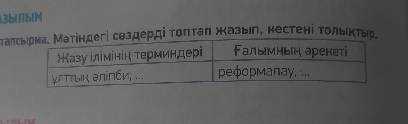 ЖАЗЫЛЫМ 2-тапсырма. Мәтіндегі сөздерді топтап жазып, кестені толықтыр. Жазу ілімінің терминдері Ғалымның әрекеті ұлттық әліпби, ... реформалау, ...