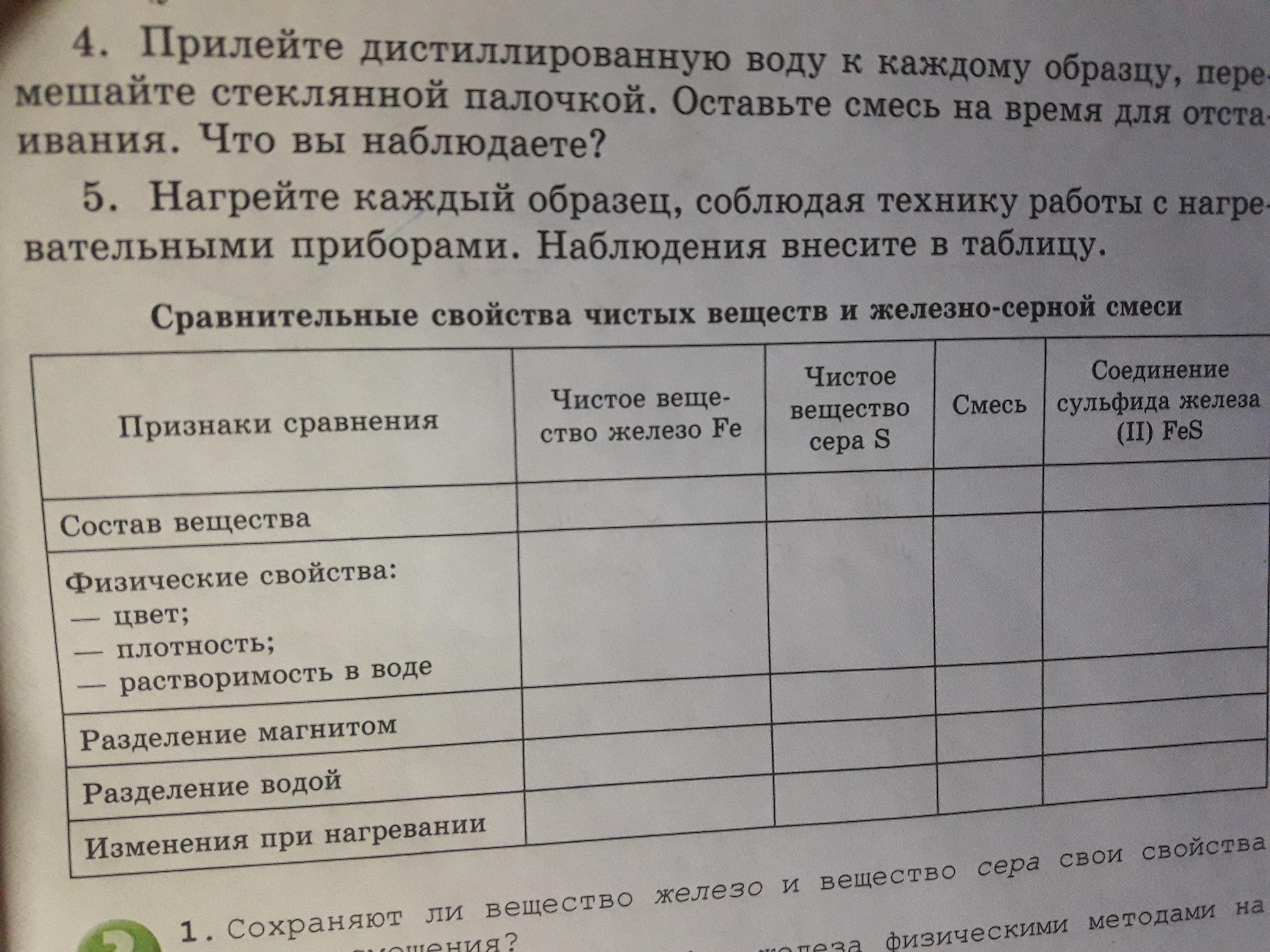 Ответ:твет:Сложное вещество FeS это вещество, которое состоит из атомов железа Fe и атомов серы S, соединенных связью. Смесь состоит из двух индивидуальных веществ - железа Fe и серы S, которые имеют свои уникальные свойства. Например, железо из смеси притягивается к магниту, атомы железа сложного вещества - нет.