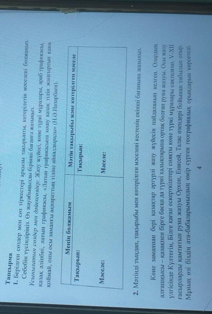 2. Мәтінді тыдап, тақырыбы мен котерілген мәселені кестенің екінші баrаінына жазыңыз.