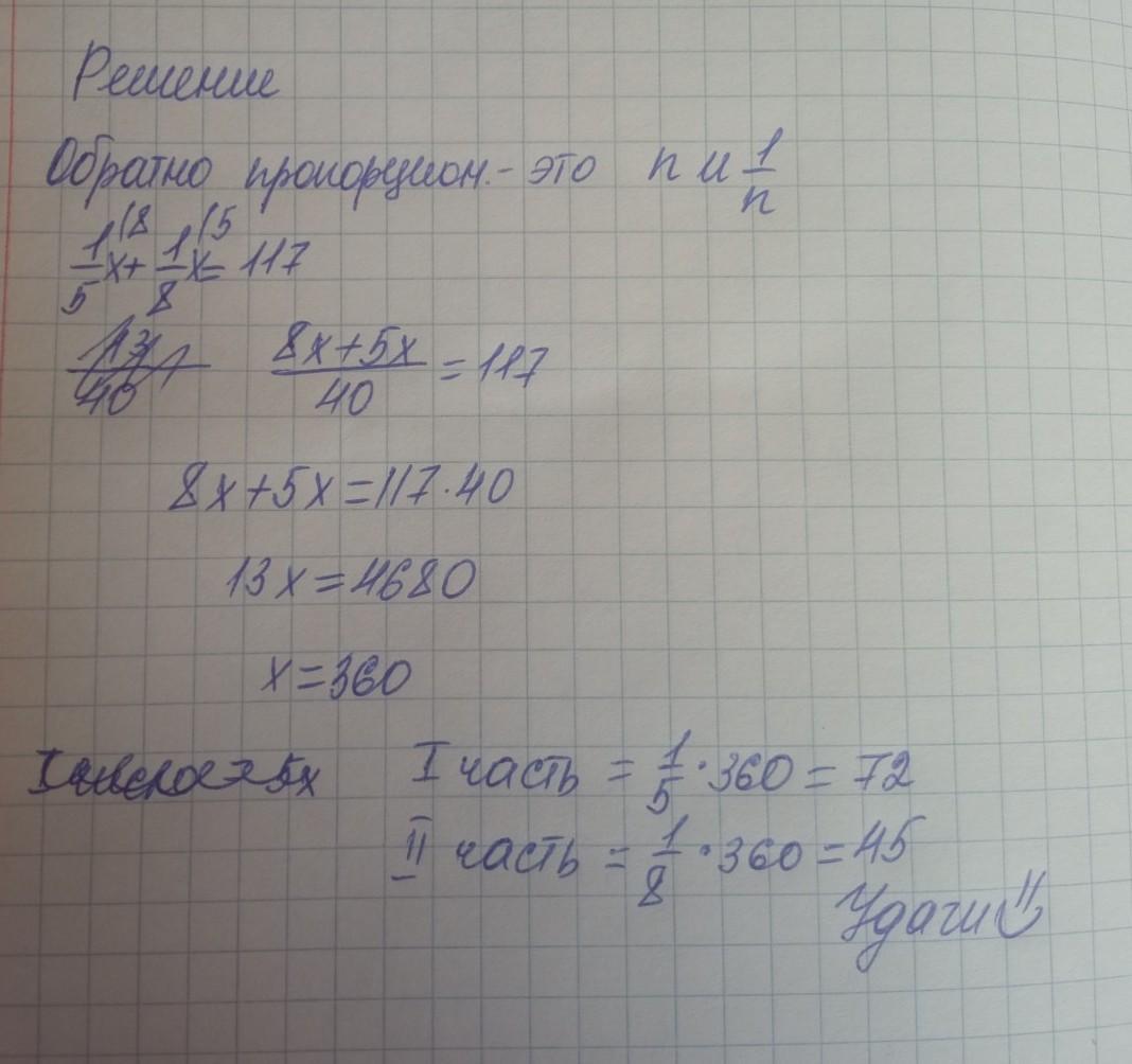 Решение текстовых задач с помощью пропорции. Урок 3 Число 117 раздели на части, обратно пропорциональные числам 5 и 8. Ответ: