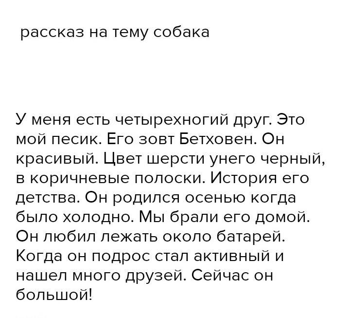 у меня есть четырёхногий друг. это мой пёсик. его зовут Бетховен. он красивый. цвет шерсти у него чёрный коричневые полоски. история его детства. он родился осенью Когда было холодно. мы брали его домой. он любил лежат около батареи. когда он подрос и стал активней и нашёл много друзей. Сейчас он большой.