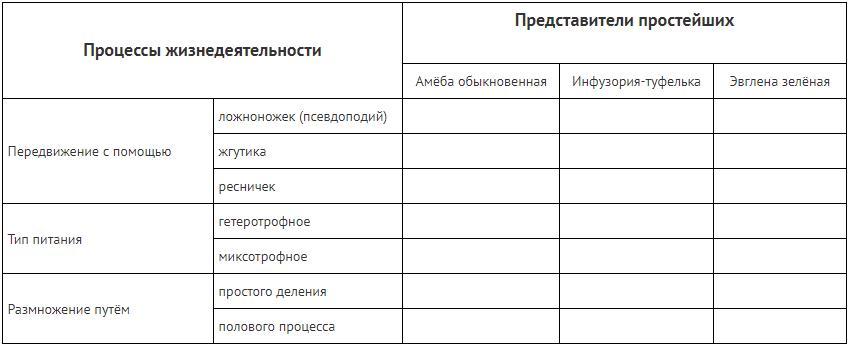 Задание 1 (фото 1) Заполните таблицу, отметьте знаком "+" процессы, характерные для амёбы обыкновенной, инфузории-туфельки и эвглены зелёной.