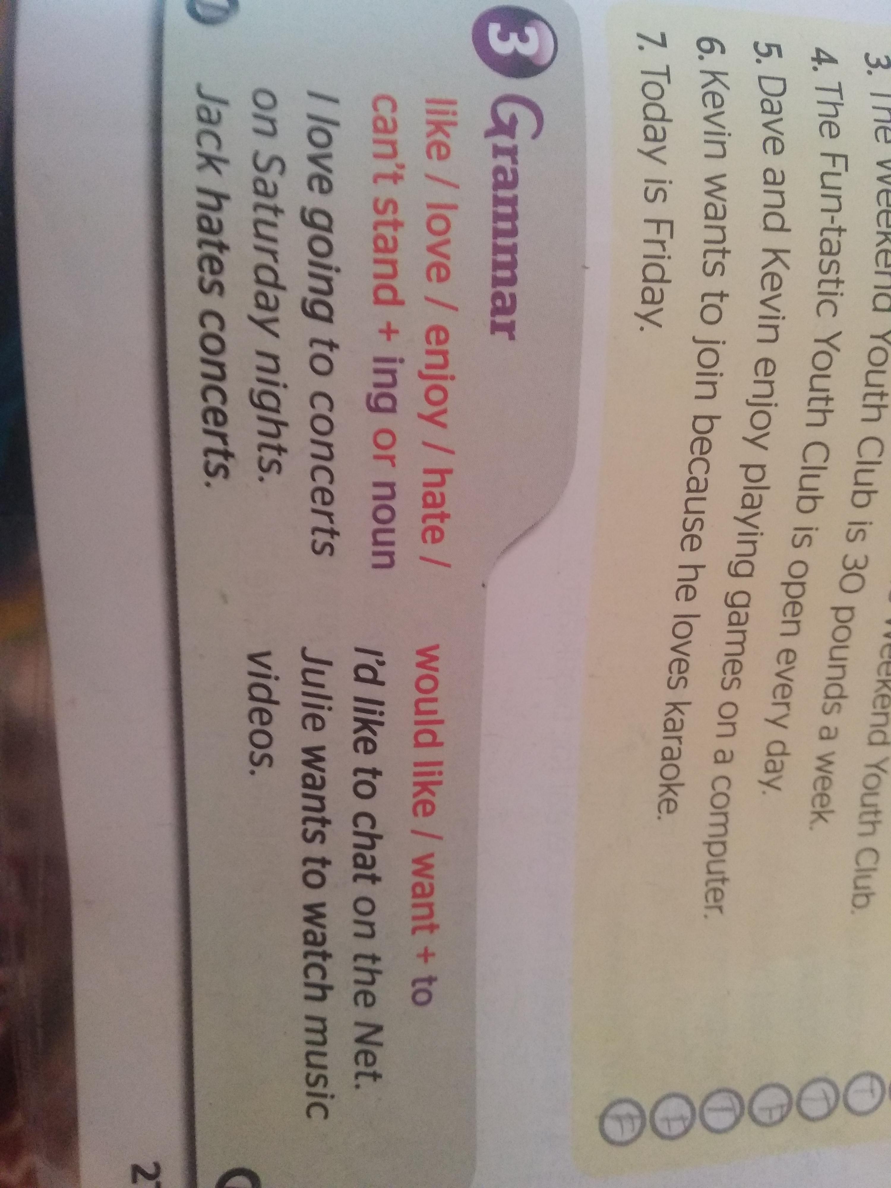 1. Karen would like to go out for dinner tonight. 2. Do you enjoy hanging out with your friends? 3. I don't want to get up early tomorrow morning. 4. Stan hates reading magazines.