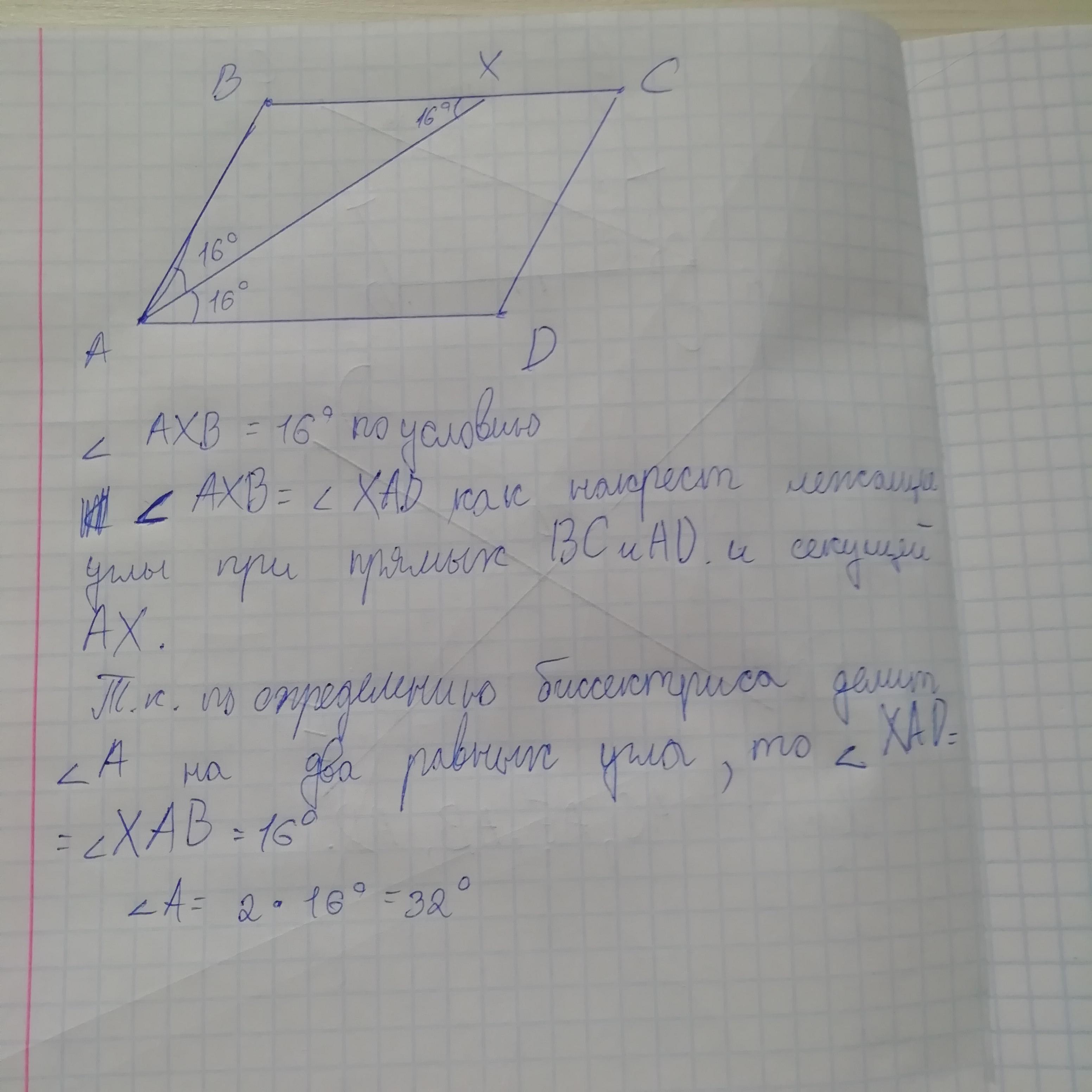 найдите величину острого угла параллелограмма ABCD если биссектриса угла A образует со стороной BC угол, равный 16°
