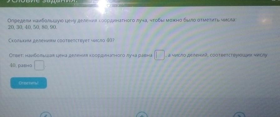 Определи наибольшую цену деления координатного луча чтобы можно было отметить числа: 20,30,40,50,80,90.., скольким делениям соответствует число 40? Ответ должен быть таким: (ОБЯЗАТЕЛЬНО) Наибольшая цена координатного луча равна [ ], а число делений, соответствует числу 40, равно [ ]. { КТО НЕПОНЕЛ ПОДРОБНОСТИ НА ФОТО }