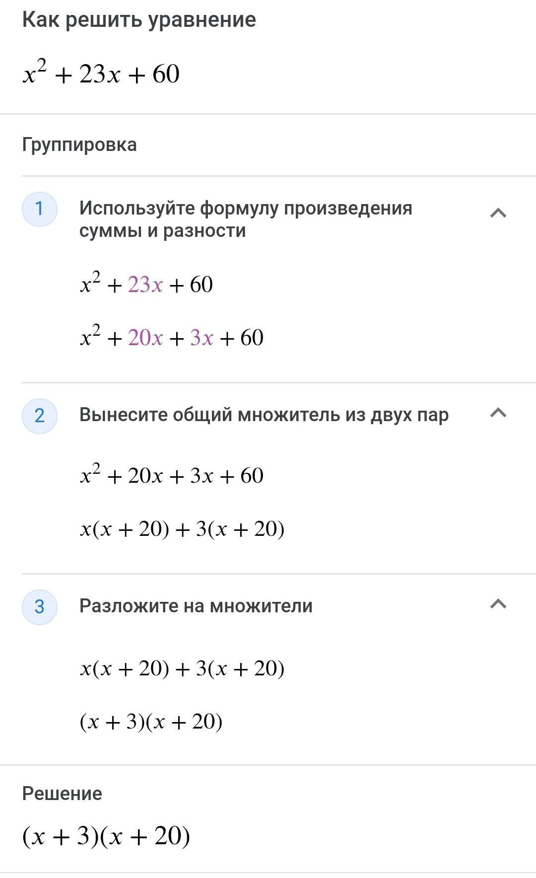 x^2+23x+60=x^2+20x+3x+60=x(x+20)+3(x+20)=(x+20)(x+3)