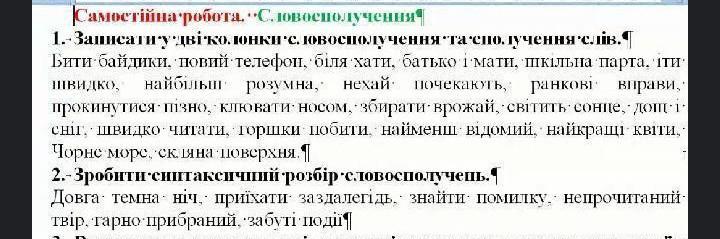 Ответ: Словосполучення: новий телефон, шкільна парта, іти швидко, ранкові вправи, прокинутися пізно, швидко читати, скляна поверхня Сполучення слів: бити байдики, біля хати, батько і мати, найбільш розумна, нехай почекають, клювати носом, збирати врожай, світить сонце, дощ і сніг, горшки побити, найменш відомий, найкращі квіти, чорне море.