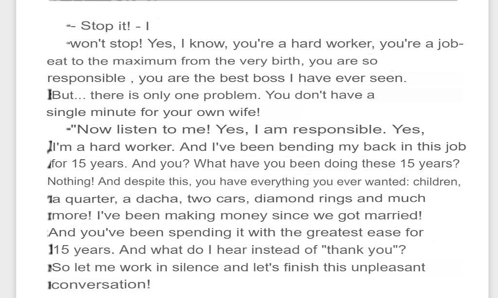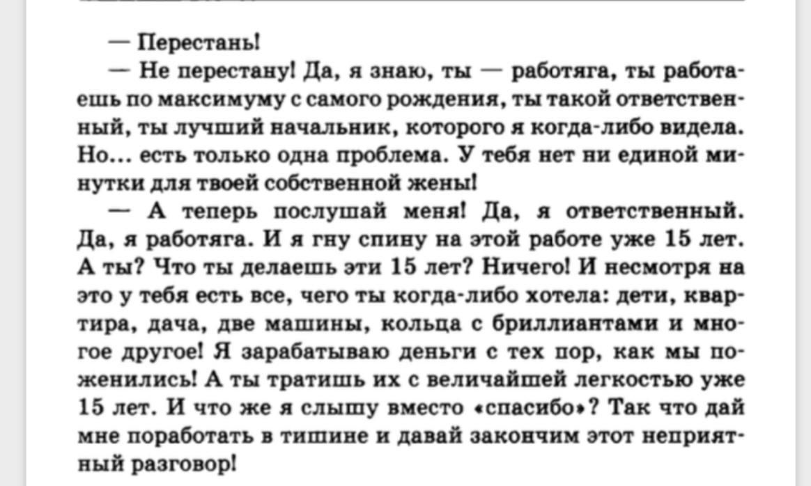 Ответ:- Ceased! - I won't stop! Yes, I know, you are a hard worker, you work to the maximum from the very beginning, you are so responsible, you are the best boss I have ever seen. N ... there is only one problem. You don't have a single minute for your own wife! - Now listen to me! Yes, I am responsible. Yes, I'm a hard worker. And I've been doing this job for 15 years now. And you? What have you been doing these 15 years? Nothing! And despite this, you have everything you ever wanted: children, an apartment, a summer residence, two cars, diamond rings and much more! I've been making money since we got married! And you have been spending them with the greatest ease for 15 years. And what do I hear instead of "thank you"? So let me work in silence and let's finish this unpleasant conversation!