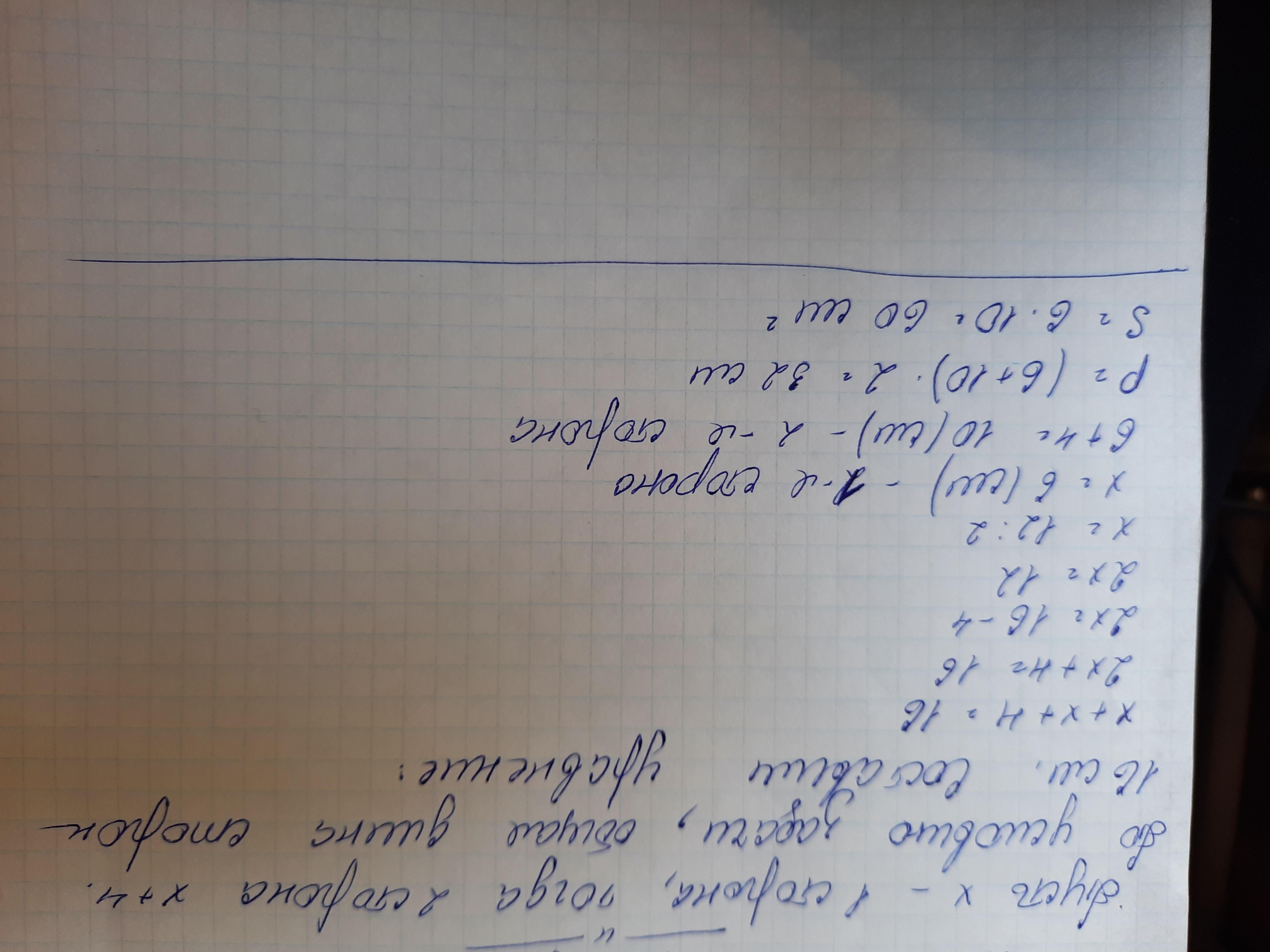 Одна сторона прямоугольника имеет длину на 4 см больше, чем другая. Общая длина этих двух сторон 16 см. Найди длину каждой стороны. Найди площадь и периметр этого прямоугольника.
