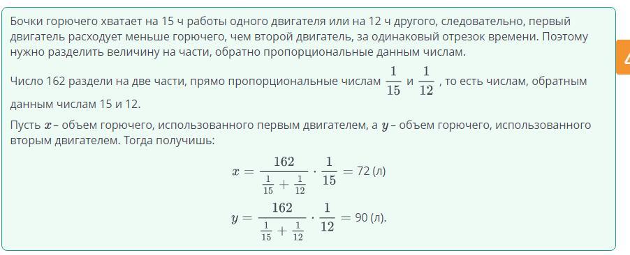 Бочки горючего хватает на 15 ч работы одного двигателя или на 12 ч другого. Сколько литров горючего использует первый двигатель, а сколько – второй двигатель, если в бочке 162 л горючего и двигатели работают вместе.