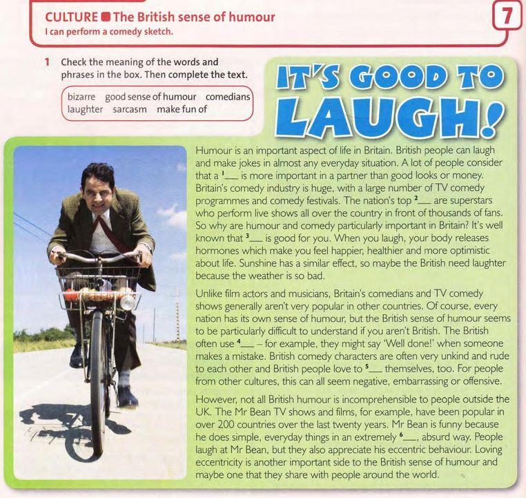 Read the text again and answer the questions. 1 According to the text, what three qualities might be important in choosing a partner? 2 How do people feel when they laugh? Why? 3 What may be the connection with the weather and laughter in Britain? 4 According to the text, what's the difference between British musicians and comedians? 5 Are people in British comedy shows always polite to each other? Explain your answer. 6 Is Mr Bean popular around the world? Explain your answer. 7 According to the text, why do people like Mr Bean?