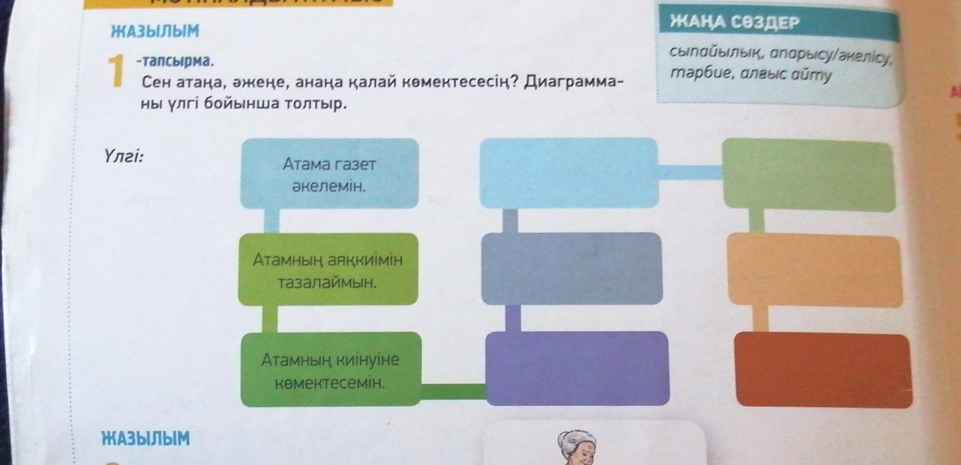 Ответ:Әжемге теледидар қосамын , Әжеге кілем қазуға көмектесемін , Әжемге сөмке апарасу көмектесемін . Анаға тамақ пысыремін, Анаға жинауға көмектесемін , Анаға киім жуамын.