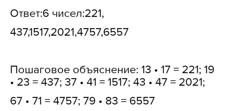 Найдите все числа, которые можно разложить на два двузначных простых множителя, разность которых равна 6. Воспользуйтесь таблицей простых чисел.