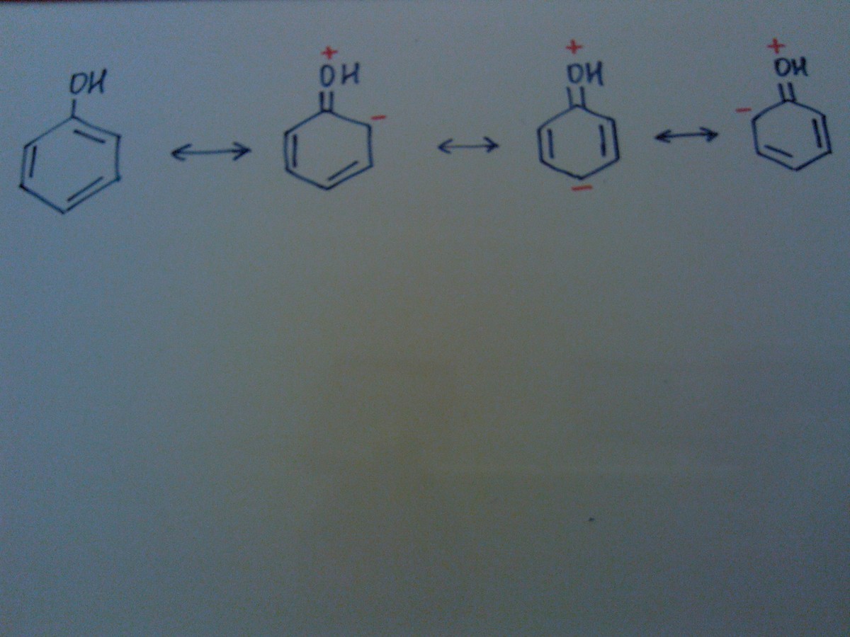 Как видно из мезомерных формул фенола, ОН- группа влияет на фенил таким образом, что в орто- и пара- положениях повышенная электронная плотность (что облегчает реакции электрофильного присоединения именно в орто- и пара- положения).