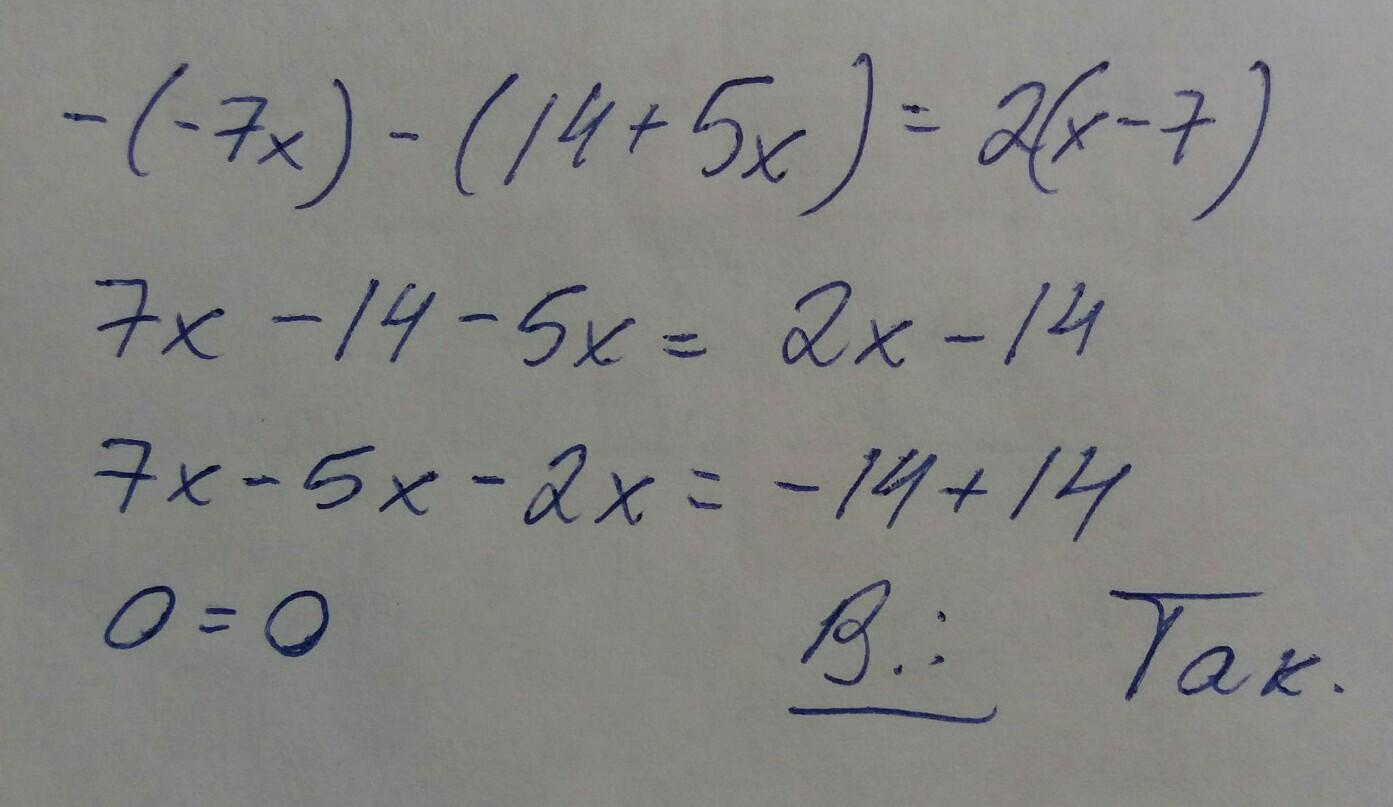 Умова завдання: Перевір, чи є рівність -(-7x) - (14 + 5x) = 2(х - 7) тотожністю. Після тотожних перетворень у лівій частині вийде вираз: Срочно даю 10 балов!!!