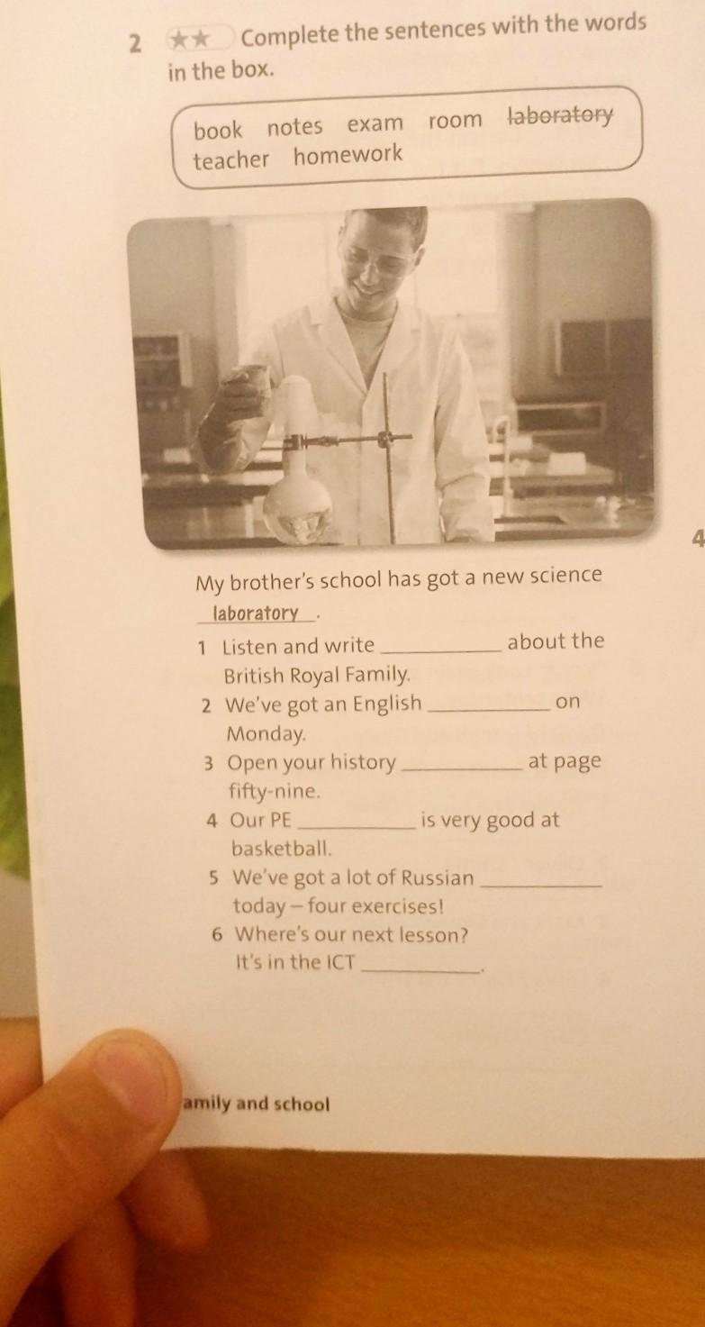 My brother's school has got a new science laboratory 1 Listen and write about the British Royal Family 2 We've got an English on Monday 3 Open your history fifty-nine. 4 Our PE is very good at basketball. 5 We've got a lot of Russian today -- four exercises! 6 Where's our next lesson? It's in the ICT at page