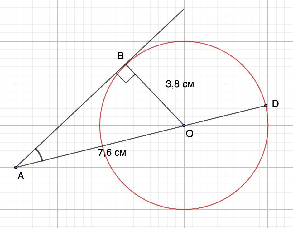 Через точку А провели секущую AD, проходящую через центр окружности О, и касательную AB. Найди /BAD, если ОA = 7, 6 см, а радиус окружности - 3, 8 см.