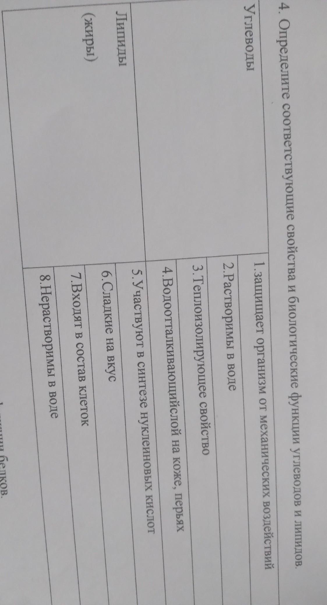 4. Определите соответствующие свойства и биологические функции углеводов и лепило Углеводы 1. защищает организм от механические водействия 2. Растворимы в воде 3. Теплоизолирующее свойство 4. Водоотталкивающийслой на коже, перьях 5. Участвуют в синтезе нуклеиновых кислот Липиды 6 Сладкие на вкус (жиры) 7. Входят в состав клеток 8.Нерастворимы в воде