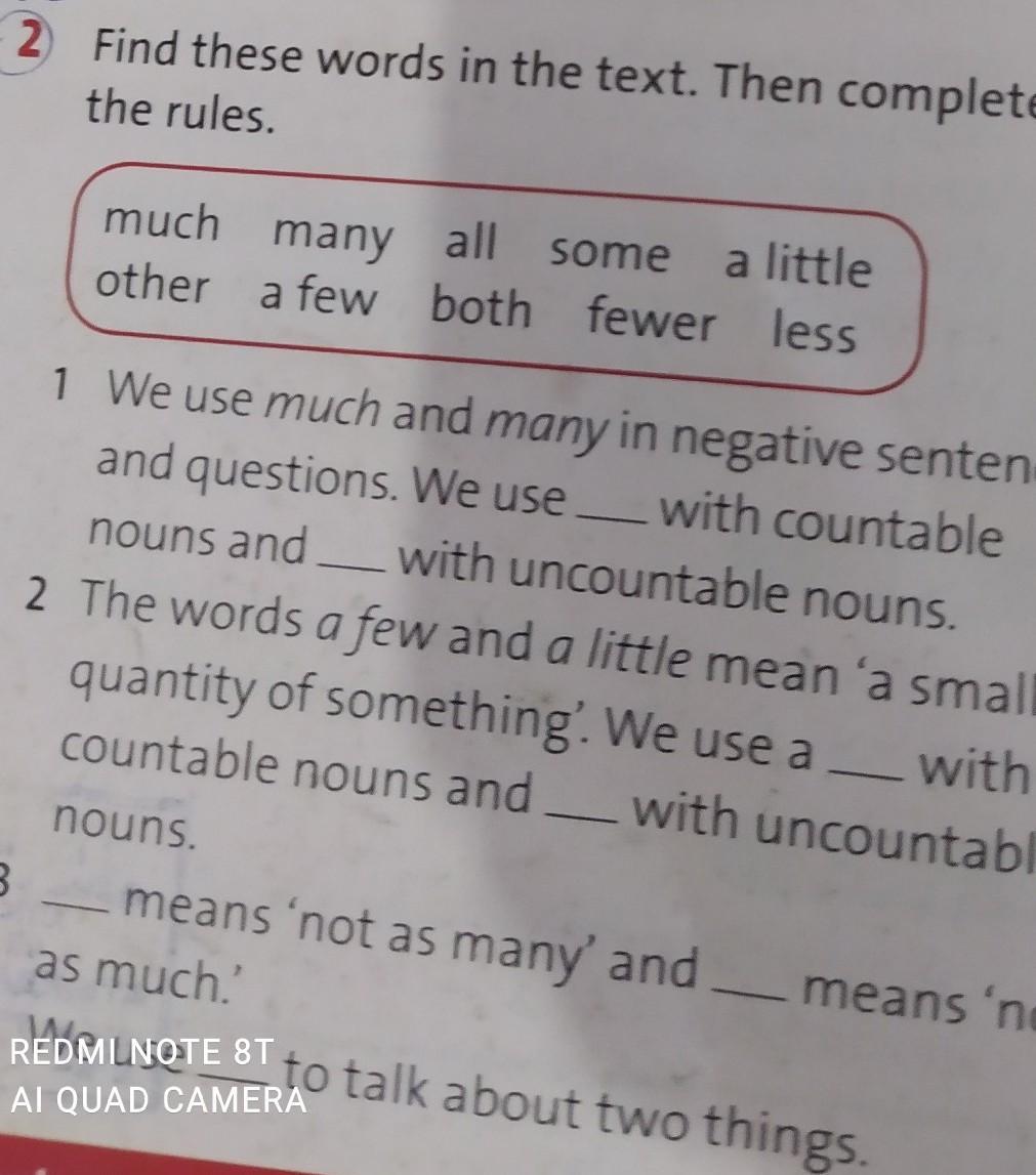 2) Find these words in the text. Then complete the rules. much many all some a little other a few both fewer less