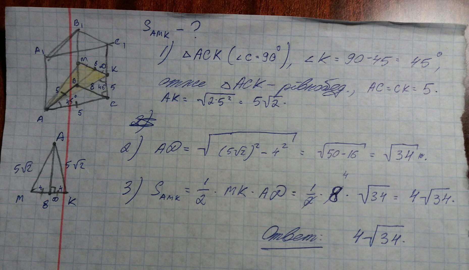 В основі прямої призми лежить рівнобедрений трикутник з основою 8 см і бічною стороною 5 см. Через основу цього трикутника проведено переріз, який утворює з площиною основи кут 45° і перетинає бічне ребро. Знайдіть площу цього перерізу.