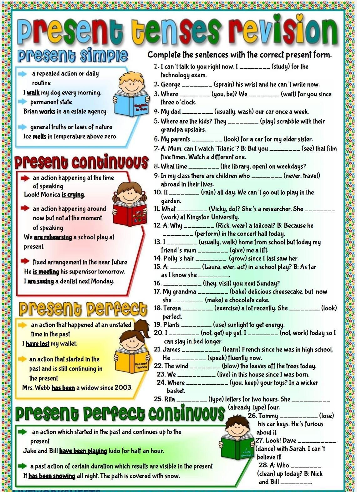 ревизия настоящего времени настоящее время Симпия Заполните предложения в правильной настоящей форме. 1.1 могу поговорить с вами прямо сейчас. Я (готовлюсь) к экзамену по технологиям. 2. Георгий. аннулированный аклион или ежедневное растяжение (растяжение) его запястья, и теперь он не может писать. Я выгуливаю свою собаку каждое утро. вечно несвежий Брайан работает в агентстве недвижимости (ты, будь)? Мы (ждем) вас с 3. Где. три часа П 4. Папе - 5. Где дети? Они - дедушка наверху. 6. Мои родители 7. A: Мама, я могу посмотреть Титаник? B: Но вы пять раз. Смотрите другой. 8. В какое время 9. В моем классе есть дети, которые (за границей в своей жизни. (Обычно мыть) нашу машину раз в неделю. - (играют) борются со своими общими истинами или законами о природе) Лед тает при температуре выше нуля. (ищу) машину для моей старшей сестры. (см.) этот фильм «Присутствовать непрерывно» (библиотека, открыта) в будние дни? (никогда, путешествовать) действие, происходящее во время выступления Смотри! Моника плачет 10. I1. ( дождь) весь день. Мы не можем выйти поиграть в сад. I1. Что (работа) в Кингстонском университете. 12. A: Почему - действие происходит вокруг (Вики, сделай)? Она исследователь. Она. сейчас но не в момент выступления. Мы репетируем школьный спектакль. ) меня лифт 13. Мама 1 друга 14. Волосы Полли - (растут) с тех пор, как я видел ее в последний раз. Исправлена договоренность в ближайшем будущем. Завтра он лечит своего начальника. В следующий понедельник я иду к дантисту. 15. A: (Лаура , Когда-либо , действовать) в школьную пиай? B: Насколько я знаю, ей 16. 17. Моя бабушка. ей 18. Тереза (они, навещают) ты в следующее воскресенье? (испечь) вкусный чизкейк, а теперь (приготовить) шоколадный торт. (упражнения) много в последнее время. Она имеет идеальный вид) идеально. 19. Создает действие, которое произошло в нераскрытое время в прошлом. Я потерял свой кошелек. (использовать) солнечный свет для получения энергии (не вставать) еще сегодня я (не работаю), поэтому я 20.1. может оставаться в постели дольше. 21. Джеймс (изучает) французский с тех пор, как учился в старшей школе. (говорить) теперь бегло. Аклион, который скрывался в прошлом и продолжает жить в настоящем. Миссис Уэбб осталась вдовой с 2003 года. Он E 22. Ветер (сдувает) листья с деревьев сегодня. 23. Ср 24. Где корзина. 25. Рита. (жить) в этом доме с тех пор, как я родился (вы, оставьте себе) свои игрушки? В плетеной (набивной) букве за два часа. Ей (уже. Лайпе) четыре. 26. Томми - (потерять) ключи от машины. Он в ярости из-за этого. 27. Смотри! Дэйв. (танец) с Сарой. Я могу в это поверить! 28. A: Who Present Perrect продолжает действие, которое началось в прошлом и продолжается до настоящего времени. Джейк и Билл играют в лудо в течение получаса. > Прошлый аклион определенной продолжительности, результаты которого видны в настоящем. Всю ночь шел снег. Тропа засыпана снегом. (убрать) сегодня? B: Ник и Билл.