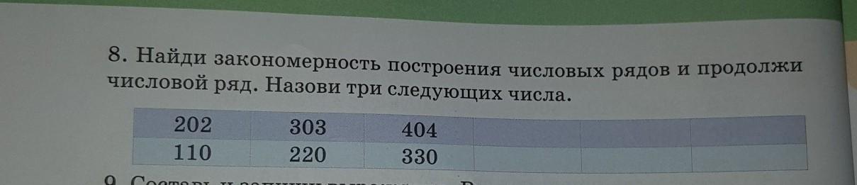 8. Найди закономерность построения числовых рядов и продолжи числовой ряд. Назови три следующих числа. 202 110 303 220 404 330