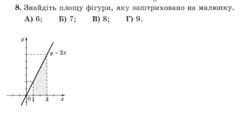 Оскільки дана функція у=2х, то при х=3 у=2*3=6. При х=1 значення функції = 2*1=2. Знайдемо площу великого трикутника. Оскільки він прямокутний, то S=1/2*a*b тоді S=1/2*3*6=9см². Знайдемо S маленького трикутника. Аналогічно: S=1/2ab= 1/2*1*2=1см². Тоді площа шуканої фігури буде дорівнювати різниці цих 2 площ: 9-1=8см²