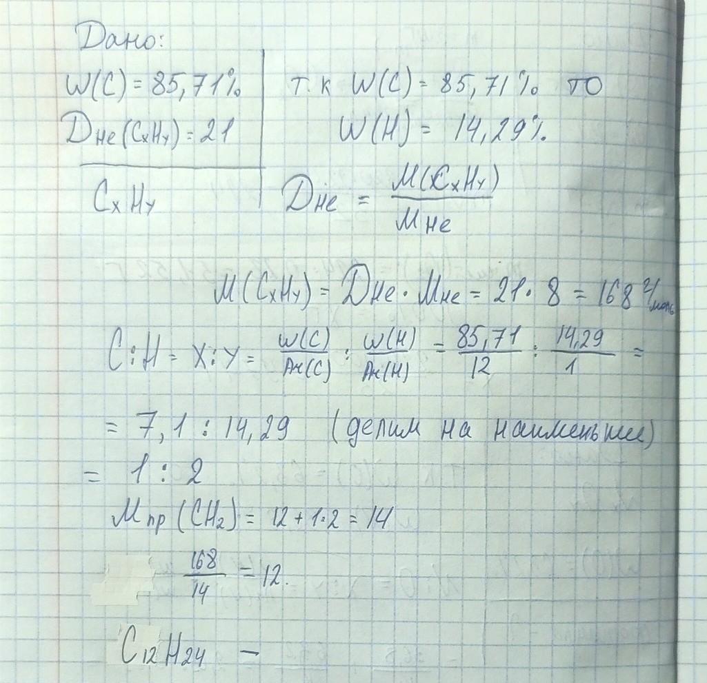 Масова частка Карбону в молекулі вуглеводнюю становить 85,71 %. Густина випарів цієї сполуки за гелієм становить 21. Установіть молекулярну формулу сполуки.