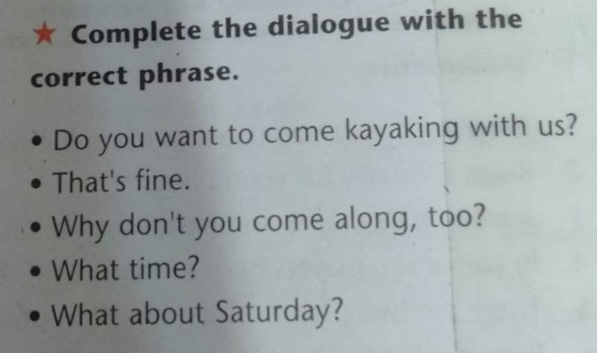 3 Complete the dialogue with the correct phrase. • Do you want to come kayaking with us? • That's fine. • Why don't you come along, too? • What time? • What about Saturday?