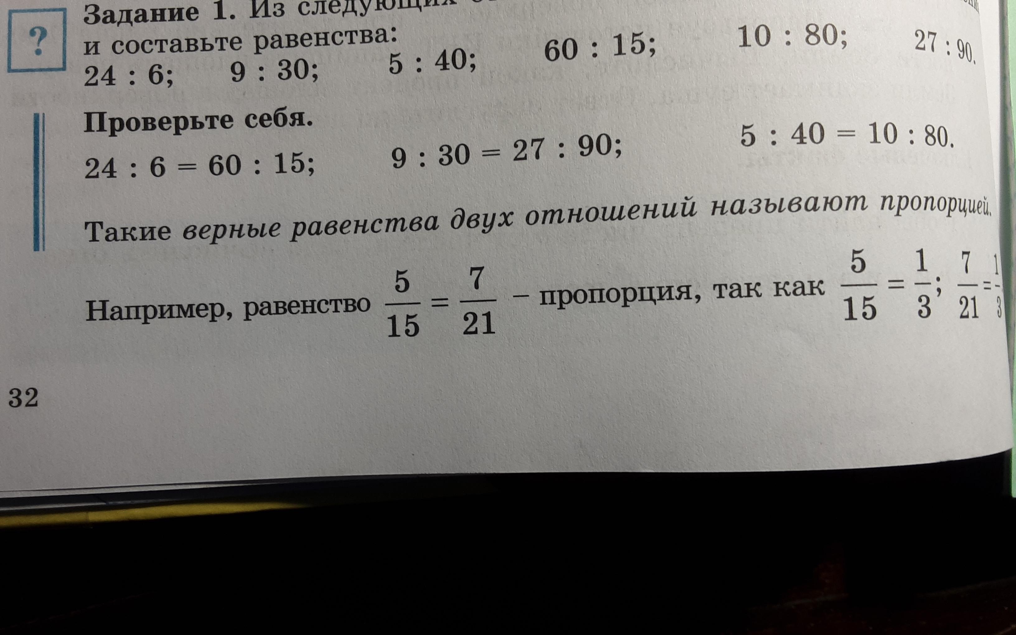 ? I. Пропорция. Задание 1. Из следующих отношений выберите равные отношения и составьте равенства: 24 : 6; 9:30; 5 : 40; 27: 90. 60 : 15; 10 : 80; Проверьте себя. 10 00 помогите