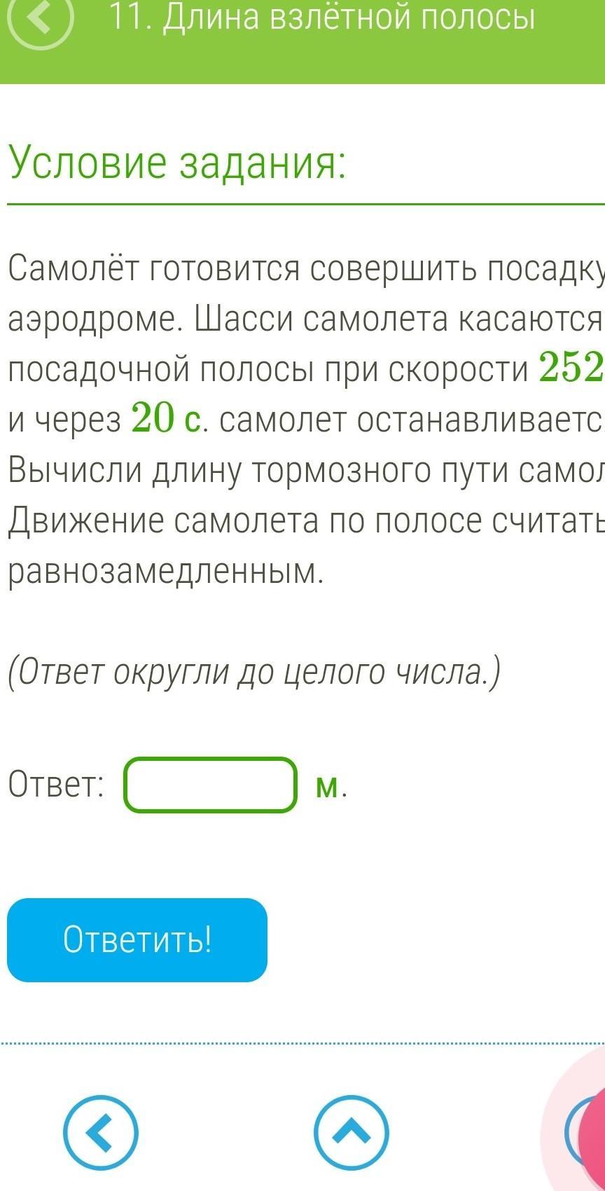 Самолёт готовится совершить посадку на аэродроме. Шасси самолета касаются посадочной полосы при скорости 252 км/ч, и через 20 с. самолет останавливается. Вычисли длину тормозного пути самолёта. Движение самолета по полосе считать равнозамедленным. (Ответ округли до целого числа.) Ответ: м.