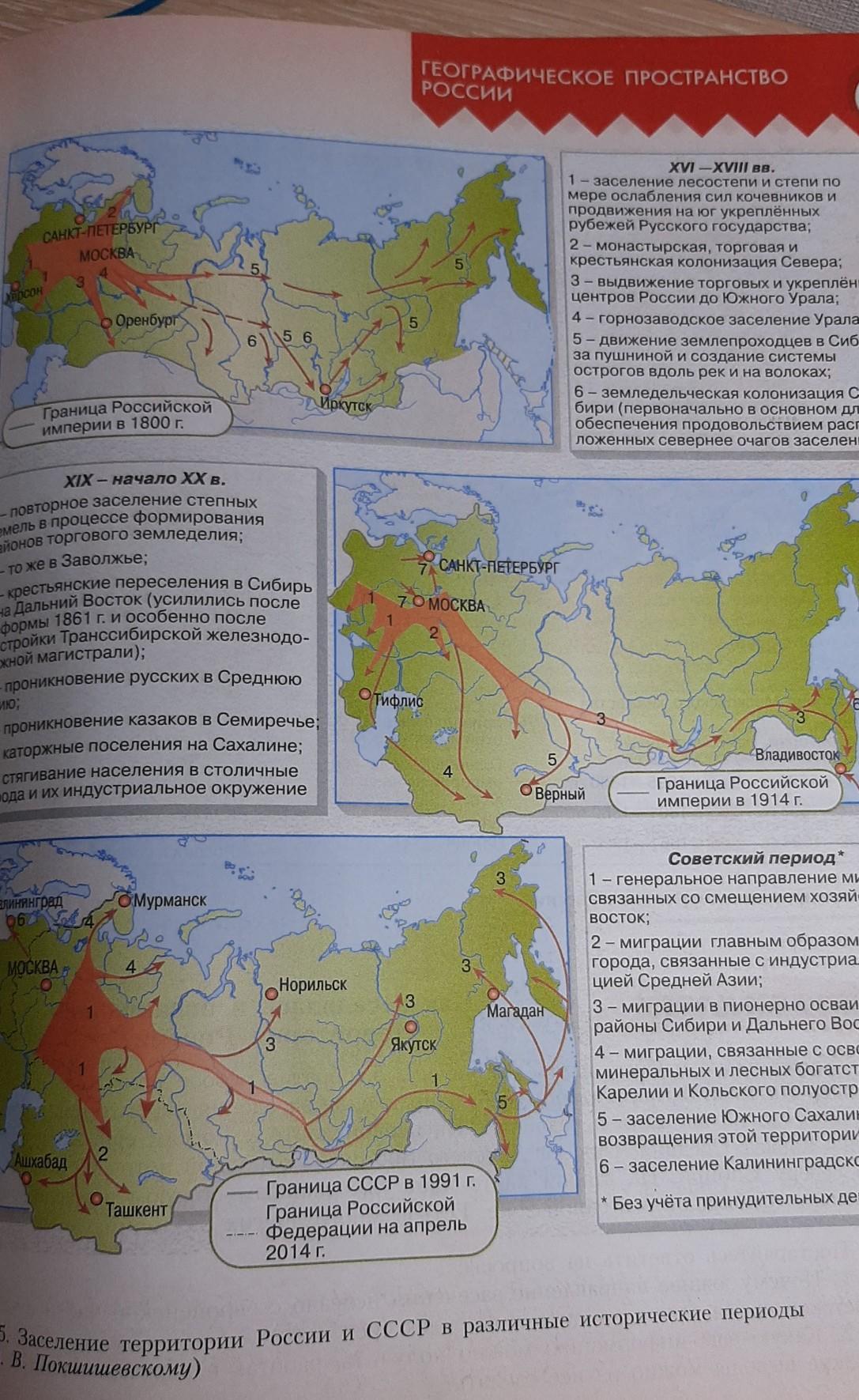 Постарайтесь ответить на вопросы: 1. Почему южное направление заселения исчезло с европейской части страны в советское время (ответ найдите в легендах трёх карт)? 2. Какую ещё информацию можно получить, работая с картами на рисунке 5, и какие выводы можно из неё сделать?