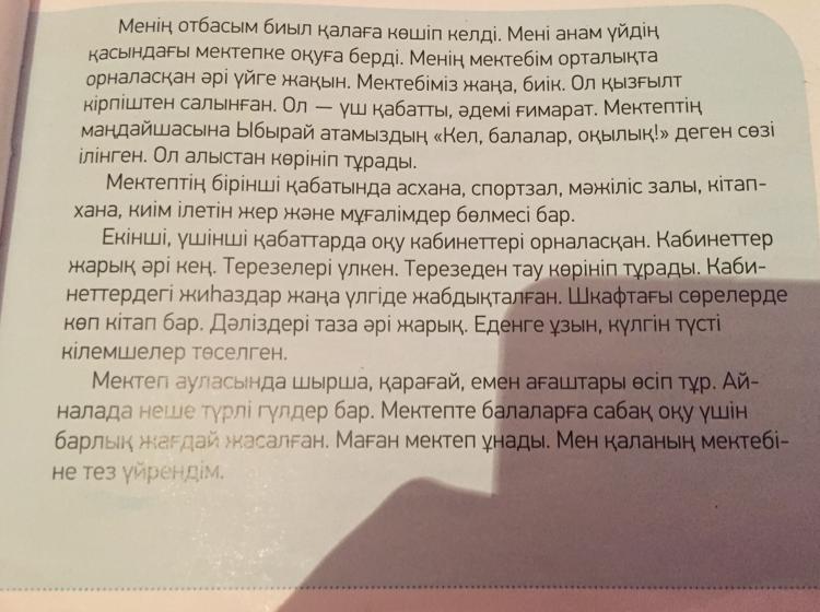 Прилагательные: жаңа, биік, қызғылт кірпіш, әдемі, жарық, кең, үлкен, таза, ұзын, күлгін түсті.