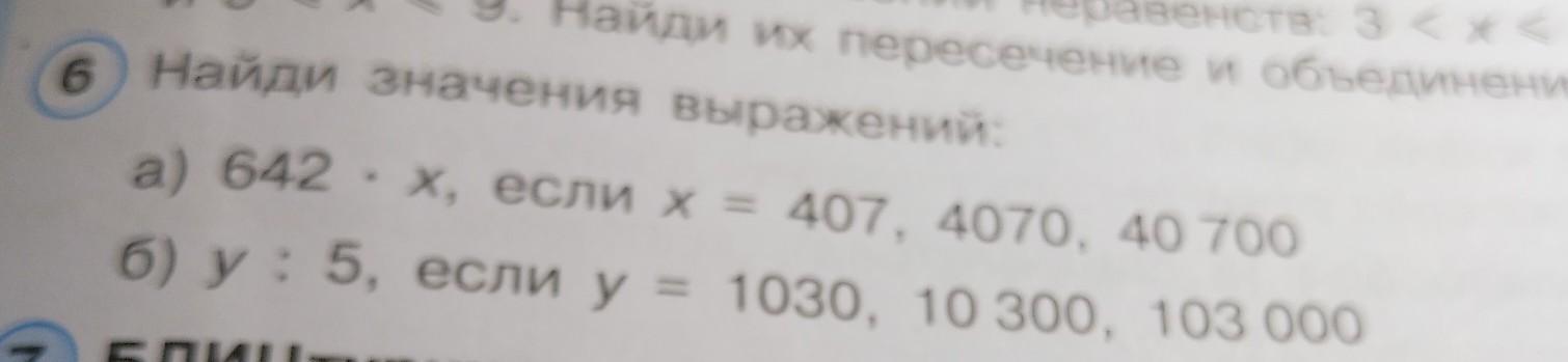 6) Найди значения выражений: а) 642 • x, если х= 407, 4070, 40 700 б) у: 5, если у = 1030, 10 300, 103 000
