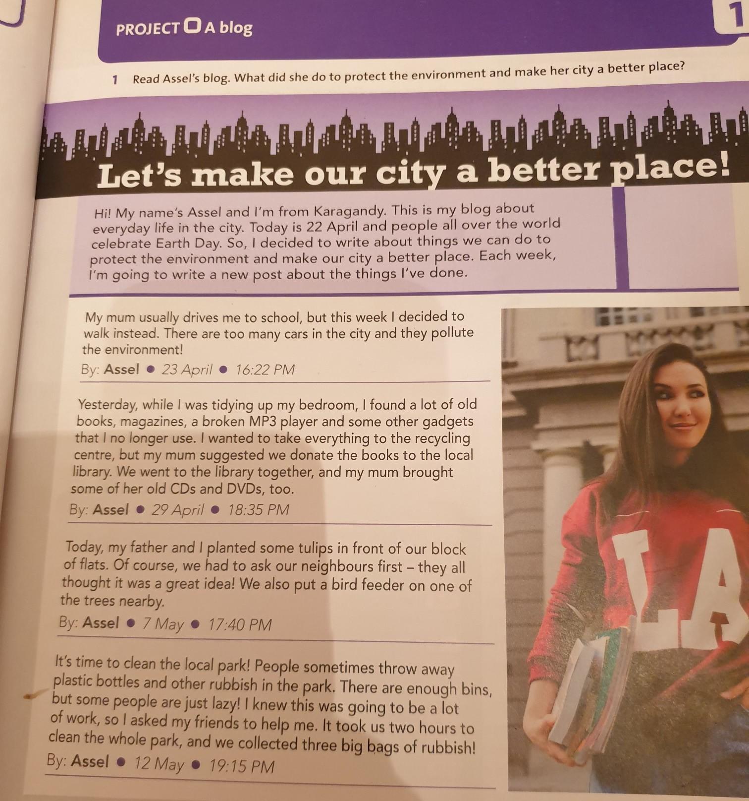 My mum usually drives me to school, but this week I decided to walk instead. There are too many cars in the city and they pollute the environment! Yesterday, while I was tidying up my bedroom, I found a lot of old books, magazines, a broken MP3 player and some other gadgets that I no longer use. I wanted to take everything to the recycling centre, but my mum suggested we donate the books to the local library. We went to the library together, and my mum brought some of her old CDs and DVDs, too. Today, my father and I planted some tulips in front of our block of flats. Of course, we had to ask our neighbours first - they all thought it was a great idea! We also put a bird feeder on one of the trees nearby It's time to clean the local park! People sometimes throw away plastic bottles and other rubbish in the park. There are enough bins, but some people are just lazy! I knew this was going to be a lot of work, so I asked my friends to help me. It took us two hours to clean the whole park, and we collected three big bags of rubbish!