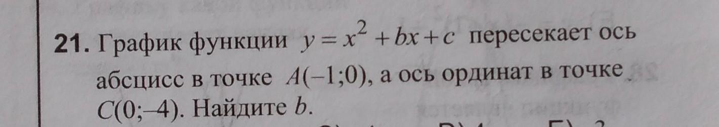 График функции y=x²+bx+c пересекает ось абсцисс в точке А (-1;0),а ось ординат в точке С(0;-4).Найдите b
