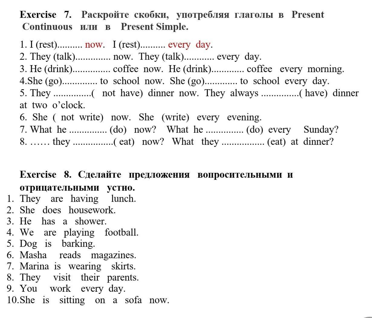 1. I am resting now. I rest every day. 2. They are talking now. They talk every day. 3. He is drinking coffee now. He drinks coffee every morning. 4.She is going to school now. She goes to school every day. 5. Are they having dinner now? They always have dinner at two o’clock? 6. What is she writing now? What does she write every evening? 7. What is he doing now? What does he do every Sunday? 8.What are they eating now? What do they eat at dinner?