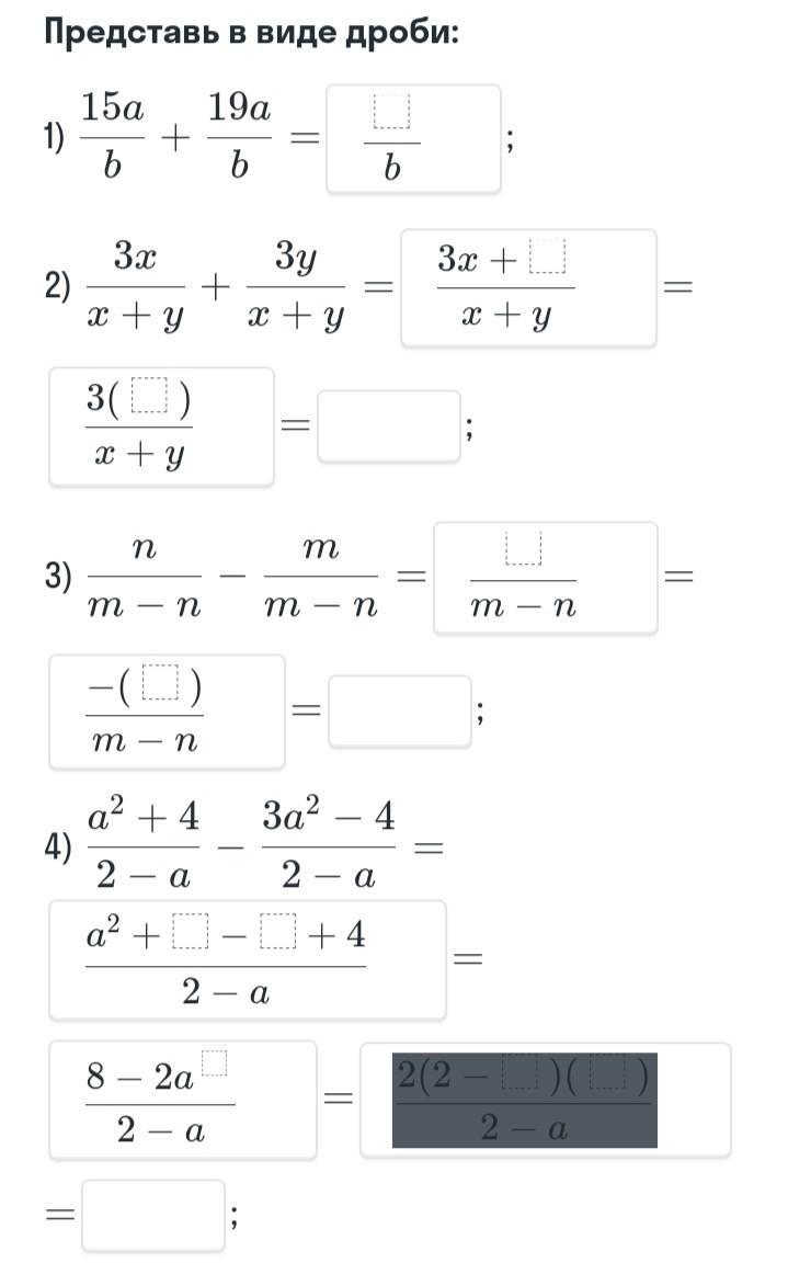 2) 3x/x+y + 3y/x+y = 3x+3y/x+y = 3(x+y)/x+y = 3;