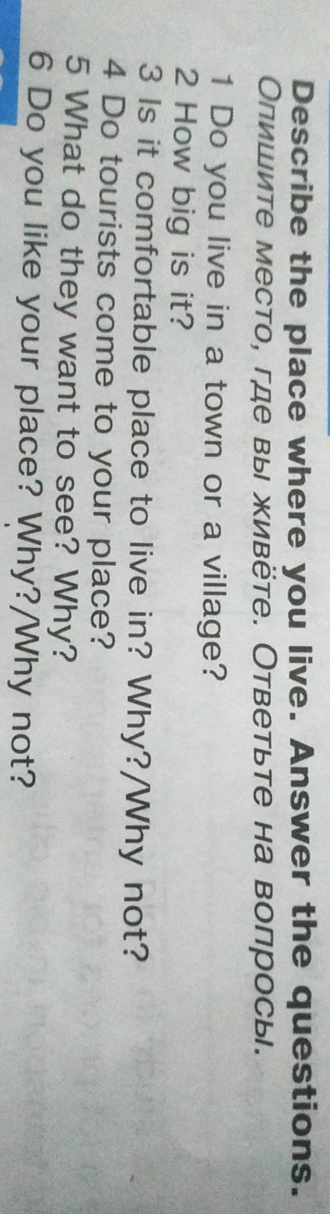 1.I live in a town 2.It's very big 3.It's comfortable to live here. Because, in the city you can develop. Indeed, in the modern world it is very important to have a good education and develop culturally. Libraries, theaters, cinemas, TR centers cannot be found in the villages.