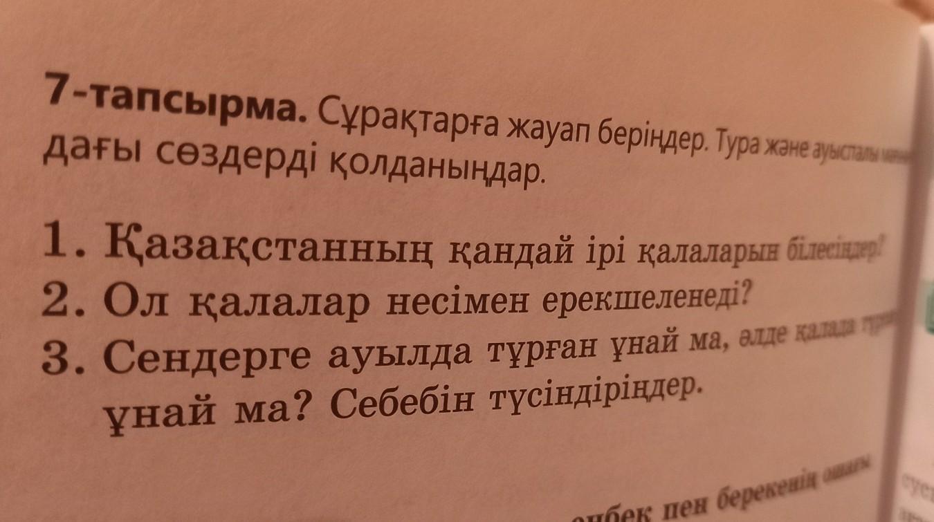 7-тапсырма. Сұрақтарға жауап беріңдер. Тура және ауыспалы мен дағы сөздерді қолданыңдар. 1. Қазақстанның қандай ірі қалаларын білесіңдер? 2. Ол қалалар несімен ерекшеленеді? 3. Сендерге ауылда тұрған ұнай ма, әлде қалада ти ұнай ма? Себебін түсіндіріңдер. 3-4-сабақ с Ауыл - еңбек пен берекенің ошағы сус