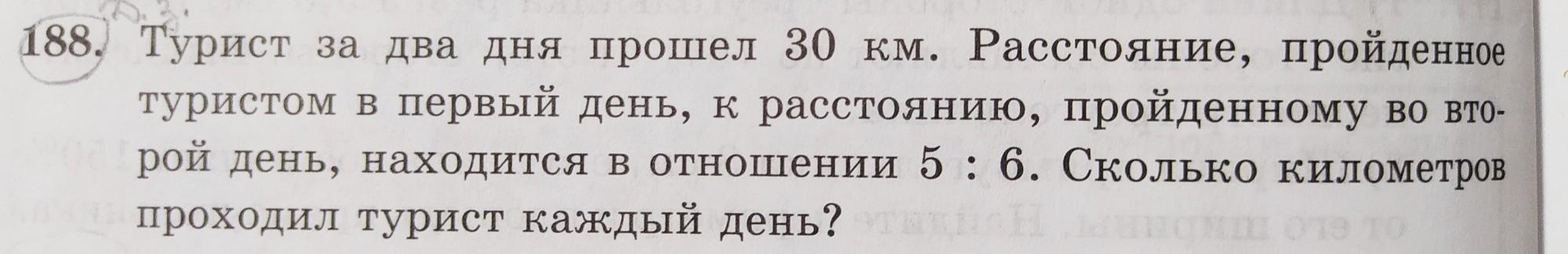 2. 188. Турист за два дня прошел 30 км. Расстояние, пройденное туристом в первый день, к расстоянию, пройденному во вто- рой день, находится в отношении 5:6. Сколько километров проходил турист каждый день?
