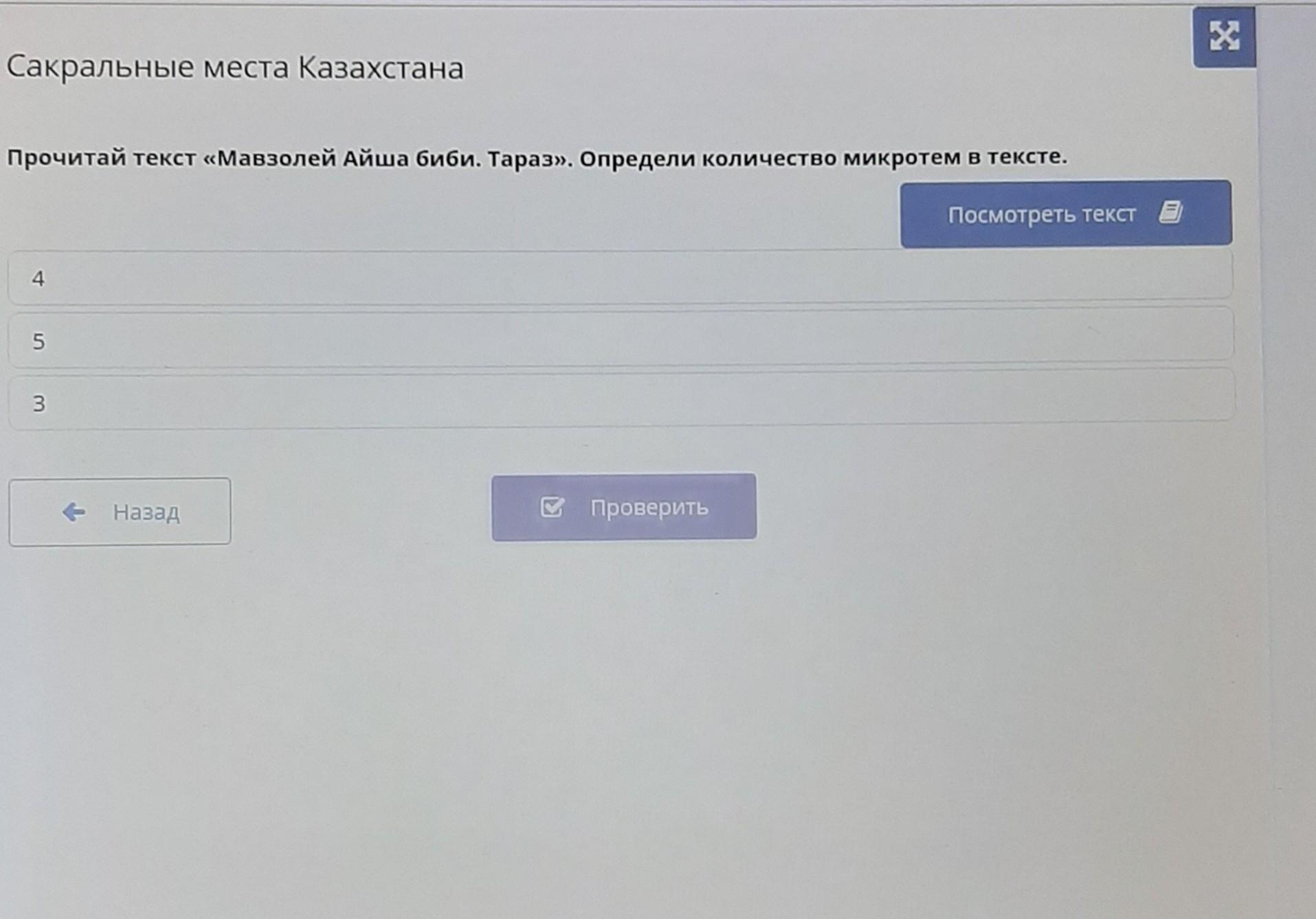 Сакральные места Казахстана Прочитай текст «Мавзолей Айша биби. Тараз». Определи количество микротем в тексте. Посмотреть текст 4 5 3 С Проверить + Назад