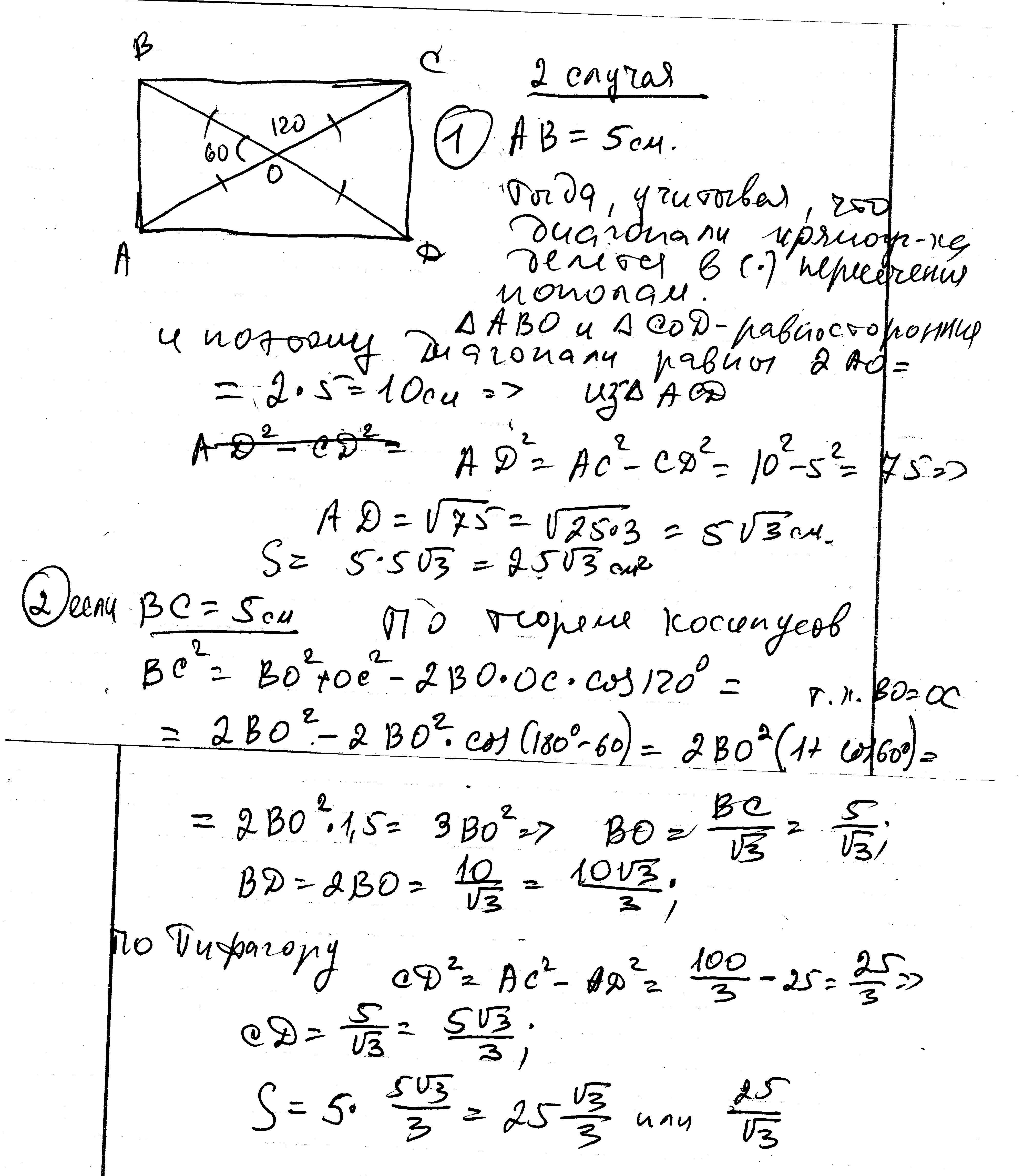 Найдите площадь прямоугольника, если одна из его сторон равна 5 см, а угол между диагоналями равен 60 градусов.