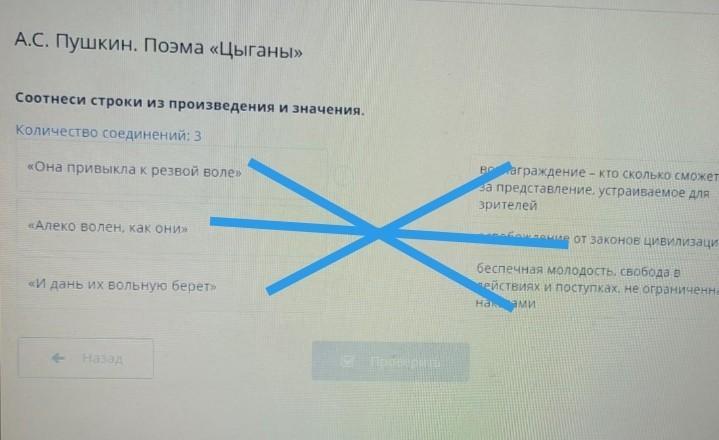 А.С. Пушкин. Поэма «Цыганы» Соотнеси строки из произведения и значения. Количество соединений: 3 «Она привыкла к резвой воле» вознаграждение – Кто сколько сможет – за представление, устраиваемое для зрителей «Алеко волен, как они» Освобождение от законов цивилизации беспечная молодость, свобода в действиях и поступках, не ограниченная «И дань их вольную берет» наказами Назад hr