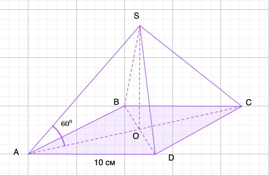 Сторона основания правильной четырехугольной пирамиды равна 10 см, а угол между боковым ребром и плоскостью основания составляет 60 °. Найдите высоту пирамиды. Пожалуйста подробно с рисунком.