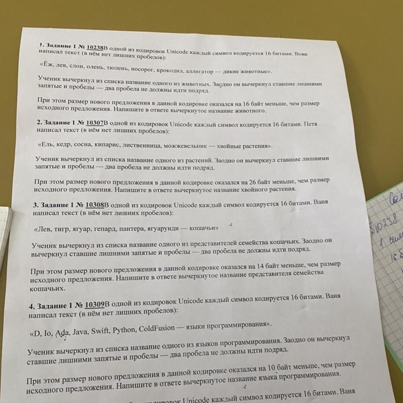 1) Размер предложения оказался на 16 байт меньше, а так как 1 символ = 16 бит или 2 байта, то значит он уменьшился на 8 символов. 2 символа - это запятая и пробел, значит на название животного остается 6 символов. Это тюлень.