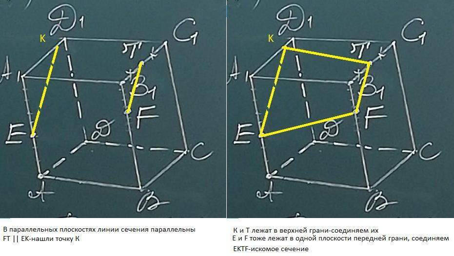 Таким способом можно построить всю границу сечения. Но можно воспользоваться и тем, что вы упомянули - параллельностью. Дело в том, что плоскости AA₁D₁D и BB₁C₁C параллельны. Плоскость сечения пересекает обе эти плоскости (грани) по прямым линиям (вторую - по линии FT).